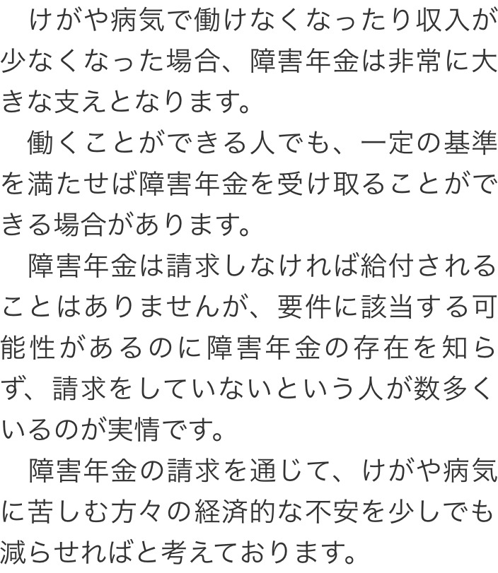 トップ取扱業務障害年金の請求 階層構造▼ 取扱業務 目次へ 障害年金の請求 社会保険・労働保険の手続 取扱業務(目次)取扱業務トップ障害年金の請求社会保険・労働保険の手続就業規則・労務管理助成金の申請労災保険の給付申請 受付時間 平日 9時~21時、土日祝 9時~18時 夜間・土日祝の相談も対応します(要予約) 所在地 〒060-0808 北海道札幌市北区北八条西4‐1-1パストラルビルN8 2F 0120-86-2403 お問合せ・アクセス・地図