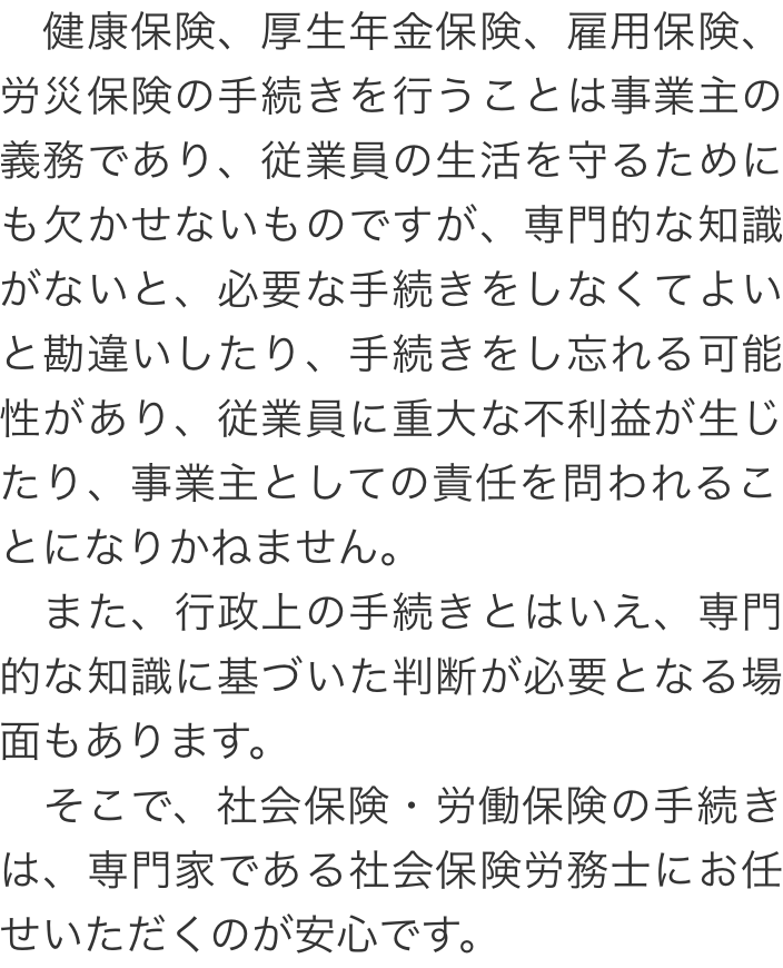 トップ取扱業務社会保険・労働保険の手続 階層構造▼ 取扱業務 目次へ 社会保険・労働保険の手続 障害年金の請求就業規則・労務管理 取扱業務(目次)取扱業務トップ障害年金の請求社会保険・労働保険の手続就業規則・労務管理助成金の申請労災保険の給付申請 受付時間 平日 9時~21時、土日祝 9時~18時 夜間・土日祝の相談も対応します(要予約) 所在地 〒060-0808 北海道札幌市北区北八条西4‐1-1パストラルビルN8 2F 0120-86-2403 お問合せ・アクセス・地図