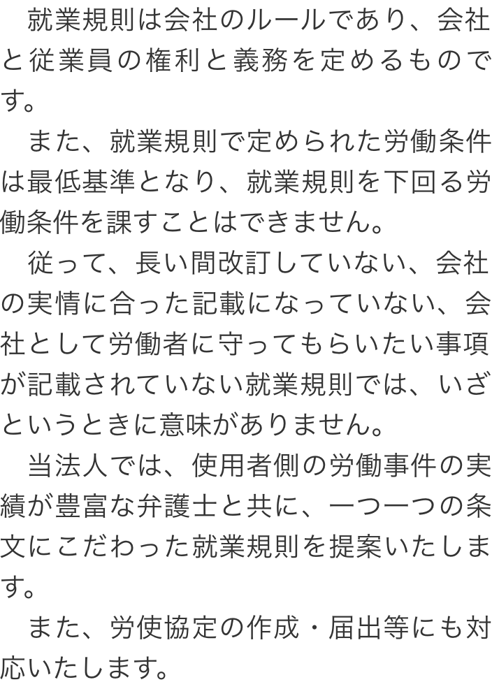 トップ取扱業務就業規則・労務管理 階層構造▼ 取扱業務 目次へ 就業規則・労務管理 社会保険・労働保険の手続助成金の申請 取扱業務(目次)取扱業務トップ障害年金の請求社会保険・労働保険の手続就業規則・労務管理助成金の申請労災保険の給付申請 受付時間 平日 9時~21時、土日祝 9時~18時 夜間・土日祝の相談も対応します(要予約) 所在地 〒060-0808 北海道札幌市北区北八条西4‐1-1パストラルビルN8 2F 0120-86-2403 お問合せ・アクセス・地図