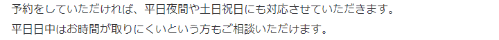 1 グループ企業の弁護士と連携し、紛争性の高い労働問題にも対応可能! 2 労務問題以外も弁護士・税理士と連携して対応! 3 個室の相談室でご相談いただけます! 4 お客様相談室を設置! 5 平日夜間・土日祝日にもご相談いただけます!